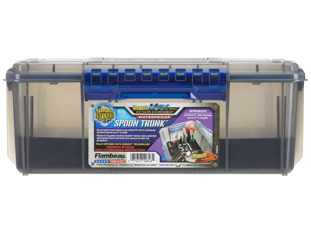 Not only does the Flambeau Max Waterproof Spoon Trunk with Zerust efficiently house and store your spoons, but it also shields them from damaging rust so you can continue to fish them for years to come rather than add them to the pile of forgotten, rusted, and pitted lures. Flambeau offers anglers an enhanced level of Zerust VCI vapor technology impregnated directly into the entirety of the trunk for unmatched rust prevention performance that lasts a minimum of 5-years. Whether you’re trolling for Walleye and Pickerel, or ledge fishing for monster bass, the Flambeau Max Waterproof Spoon Trunk with Zerust will keep your prized lures organized and in tip-top shape.