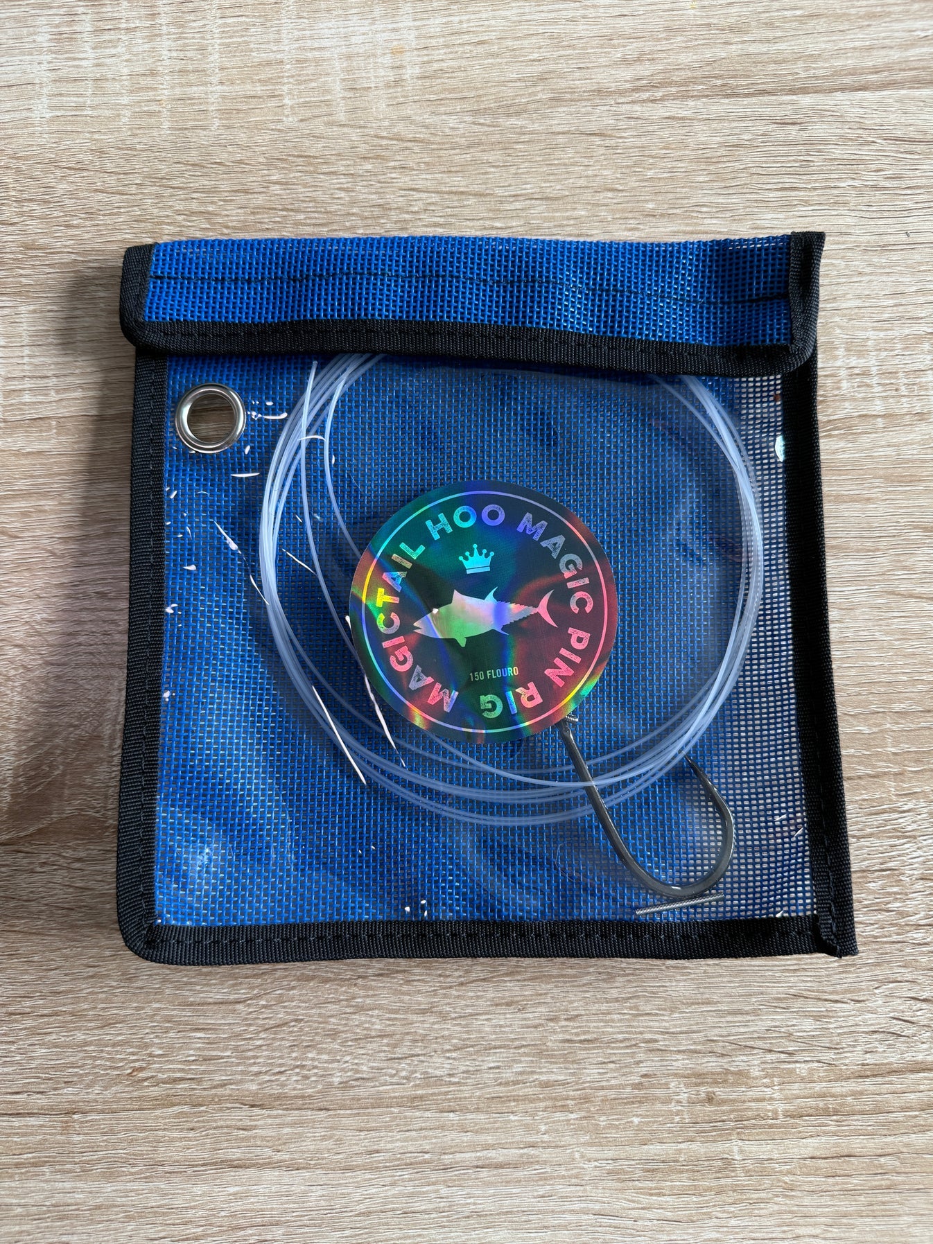 Pin Rigged- 12" of 150# Fluorocarbon leader, 9/0 Southern Tuna hook, lure bag