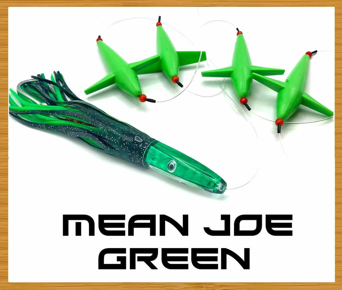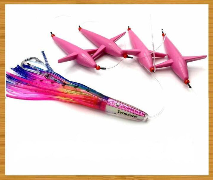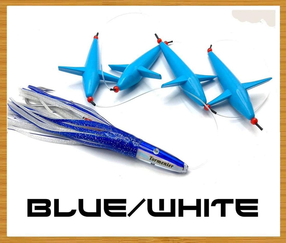 Four of our 5” Poly Birds in line in front of our Outstanding performer the TMK. All rigged on seven feet of 200lb Momoi with our 7691 Double Strength Stainless Steel hook and packaged in our 10 x 10 inch lure bag. Great for: Tuna, Mahi, Billfish, and even Wahoo (if he doesn’t cut you off). This rig should be in your arsenal for ready deployment always. Make sure you have it in one of your “Go To” colors as well as a couple others.