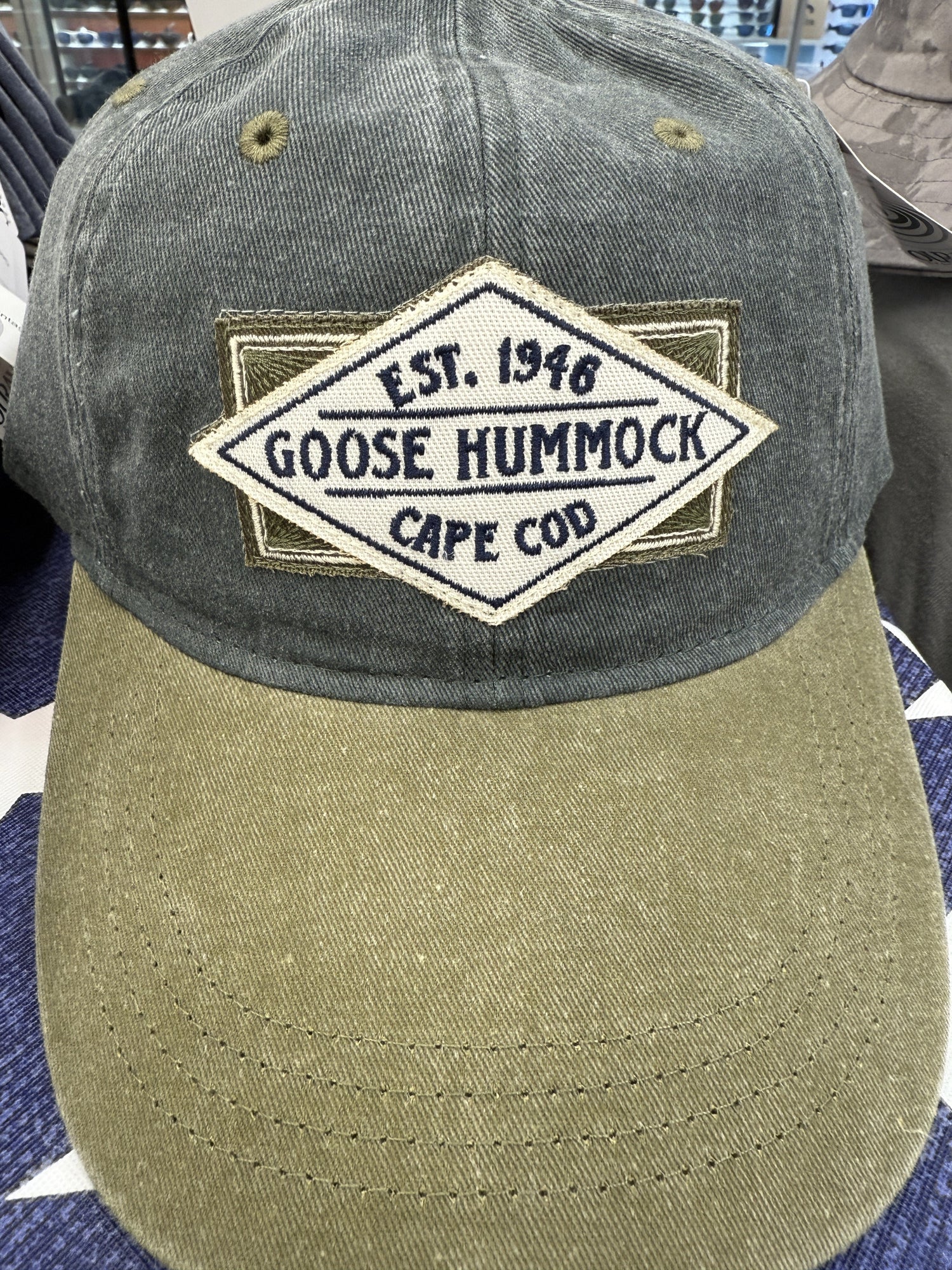 The classic Goose Hummock logo on a 2 tone twill hat with a Dad hat fit. Adjustable in the back.
