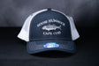 Classic trucker hat in youth size.  Goose Hummock logo on front. Snap back with mesh style Navy Blue