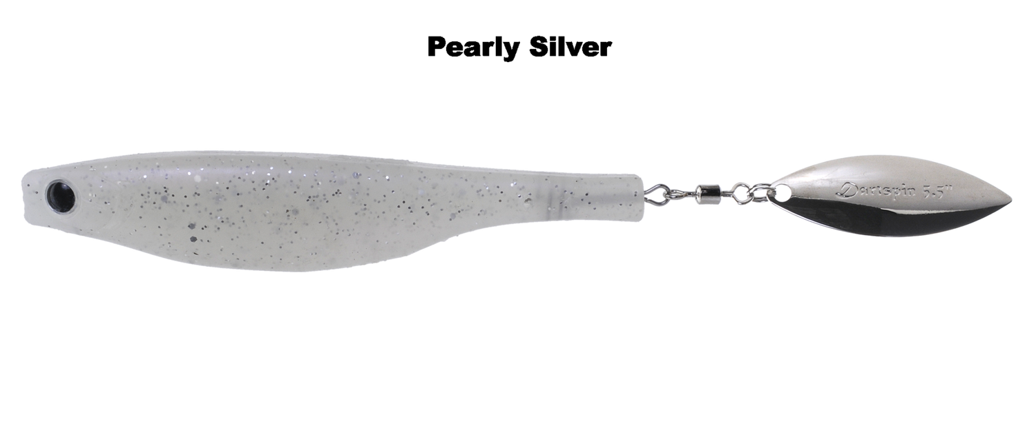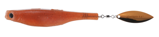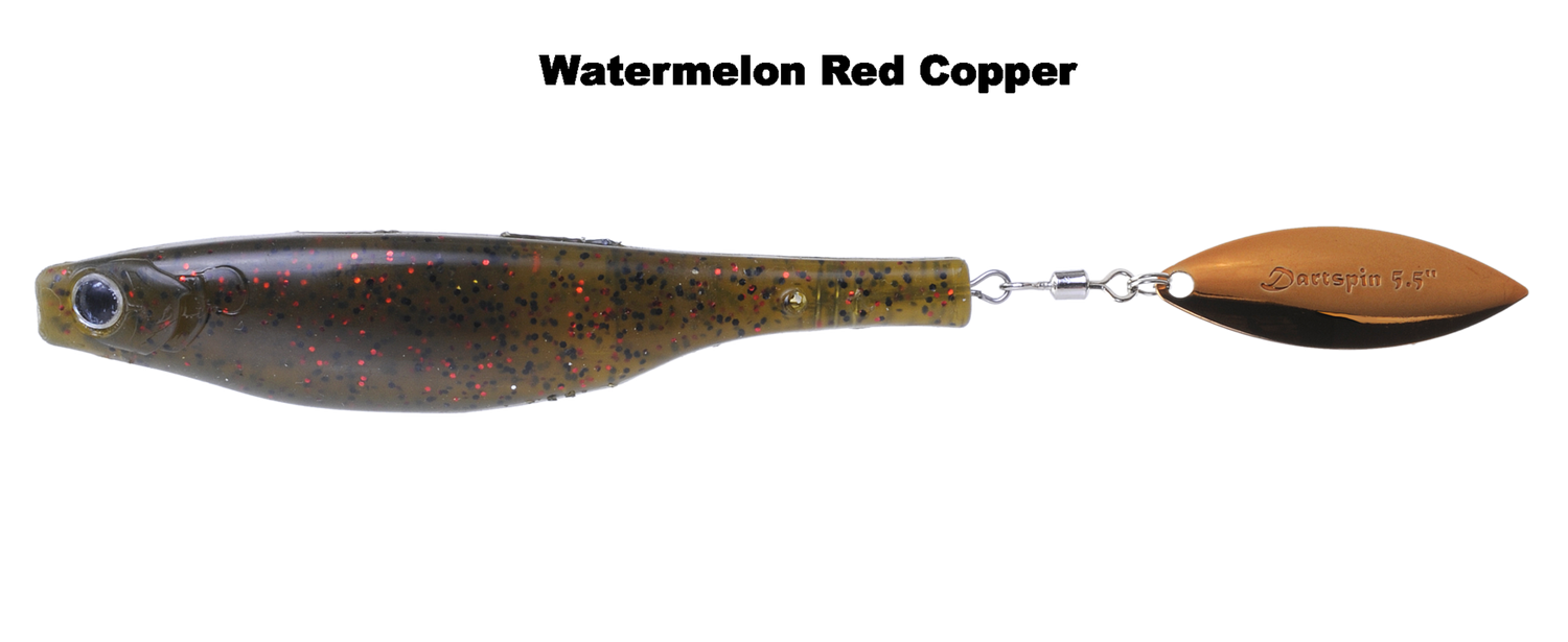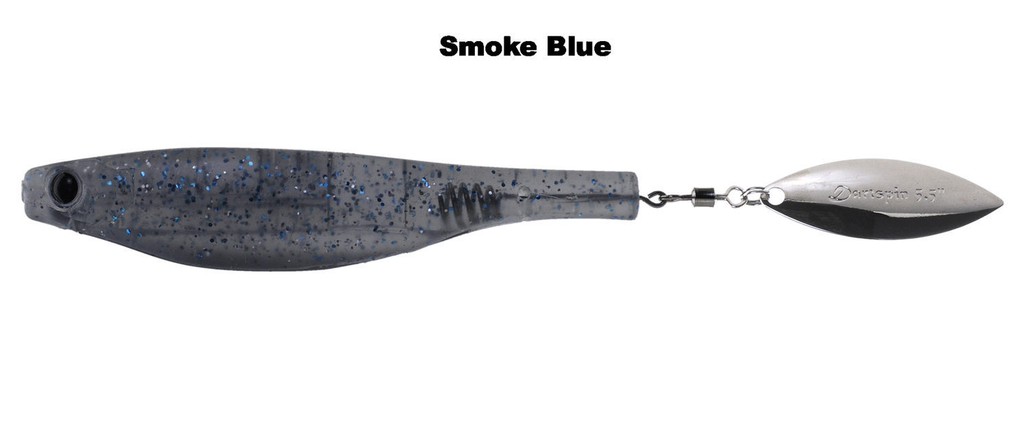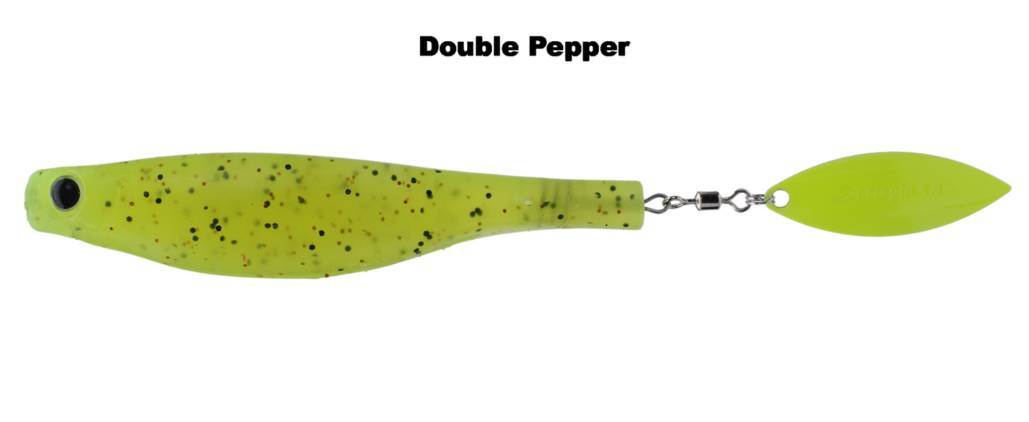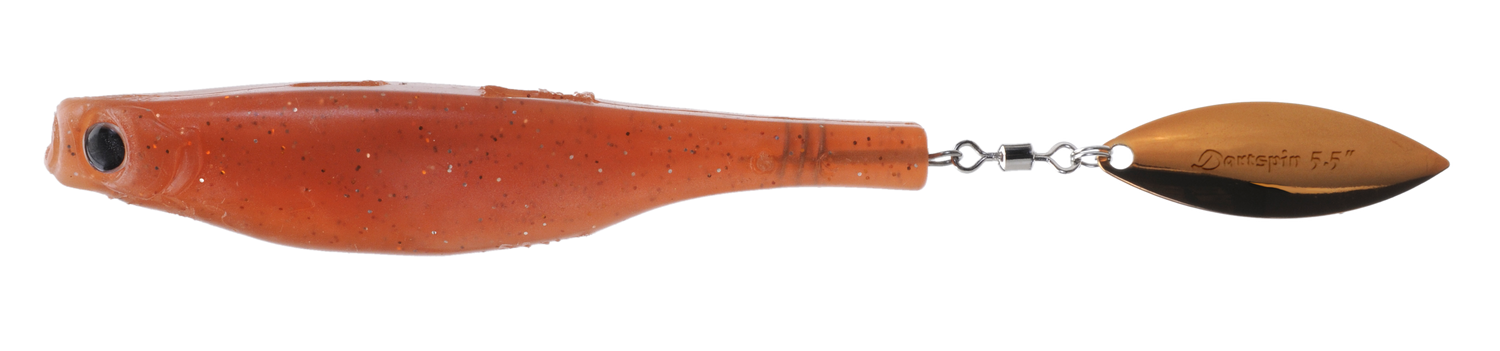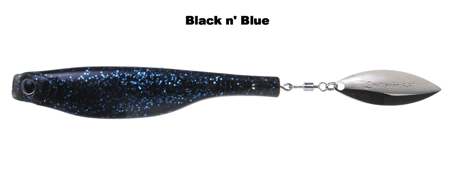 The Dartspin™ is a tough, durable, bladed softbait. It has a minnow shape body with a willow blade solidly embedded into it's tail. Extremely versatile, the Dartspin can be fished on a weedless hook, jig head, dropshot rig, Carolina or Texas rigged, or retrieved on top (or deep) with a circle hook through its nose.