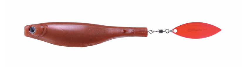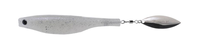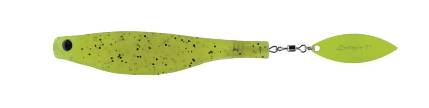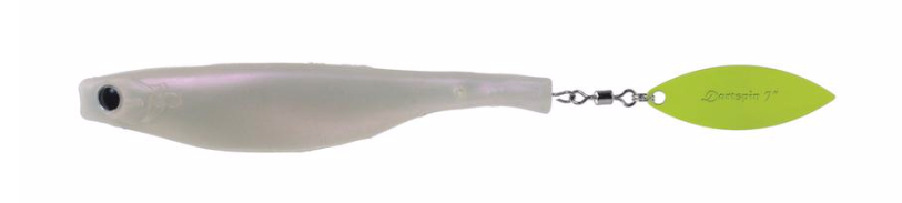 The Dartspin™ is a tough, durable, bladed softbait. It has a minnow shape body with a willow blade solidly embedded into it's tail. Extremely versatile, the Dartspin can be fished on a weedless hook, jig head, dropshot rig, Carolina or Texas rigged, or retrieved on top (or deep) with a circle hook through its nose.