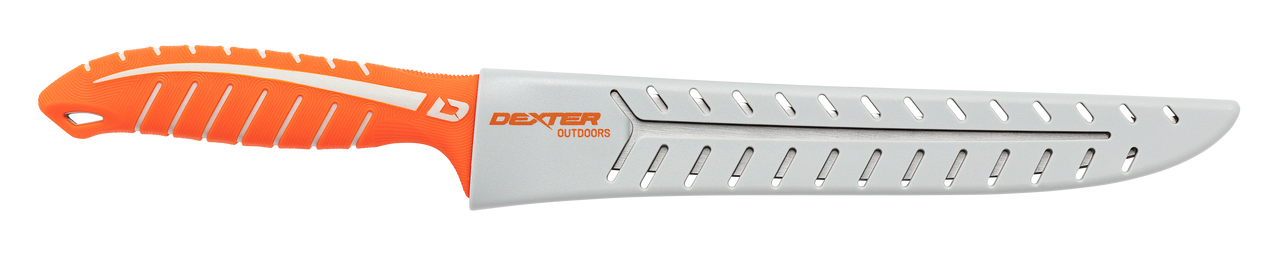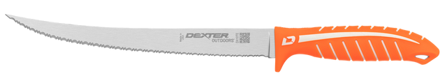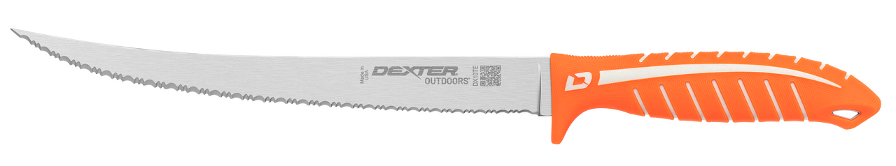 Developed specifically for anglers, the Dextreme DX10TE 10 inch tiger edge scalloped knife cuts through anything. This blade cuts through scales, cartilage and is sharp enough to give you clean fillets without tearing. The comfortable, non-slip handle accommodates any hand and finger position for greater control. The large blade is perfect for filleting cobia, Tuna, swordfish and more. This knife is sold with a sheath.