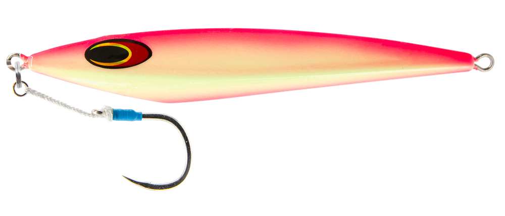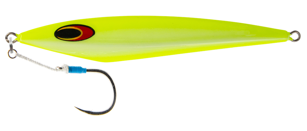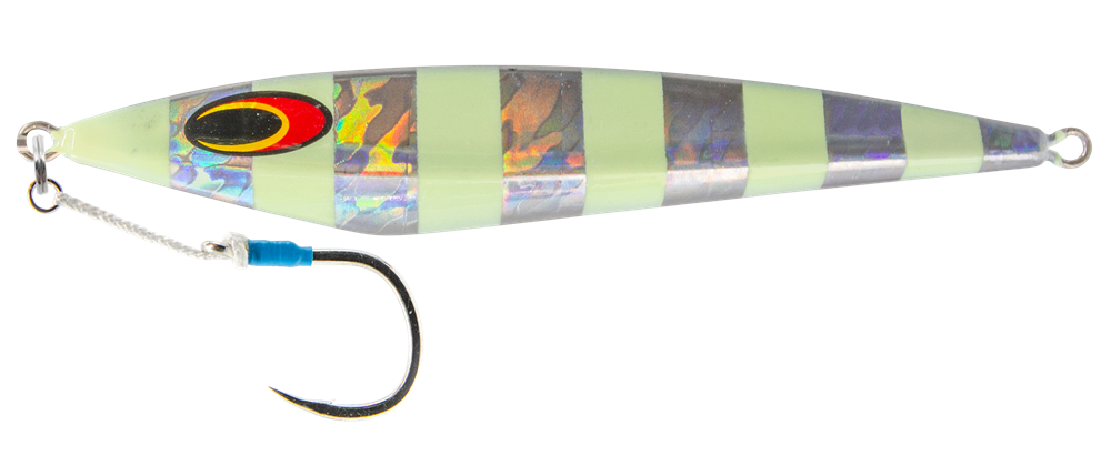The unique shape and original design of the RIDGEBACK JIG creates an exciting new jig action. It can be worked as a slow pitch jig with a flick of the rod tip or worked fast as a high-speed jig. The unique angled head design creates an erratic sideways darting movement at the top of each lift of the rod. When used slow it will flutter before starting to sink quickly, making it ideal for slow pitch jigging applications. Work it fast or slow and it will shoot off to the side giving an erratic action both pelagic and bottom feeding fish cannot resist.