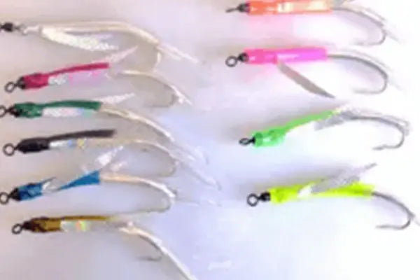 Mylar tube lures, approximately 1/3 color and 2/3 silver flash. Simulates sand eels or small bait fish. It can be used on umbrella rigs, teasers ahead of plugs, or tail hooks on metal jigs.