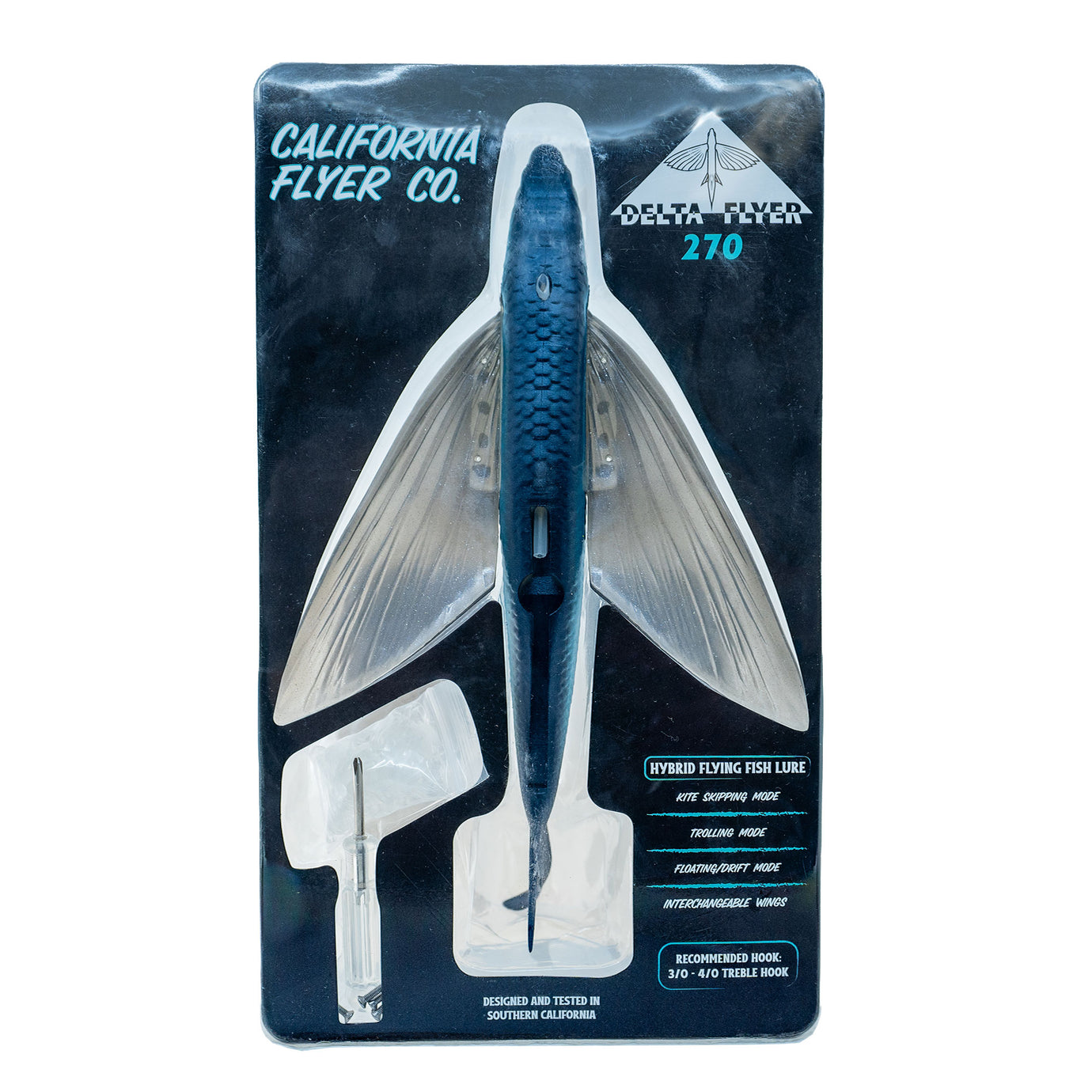 The Delta Flyer 270 from California Flyer Company is the culmination of a decade’s long journey to conceive, craft, and deliver the most effective flying fish imitation ever put to sea. Our proprietary manufacturing methods utilize 3D computer scans to achieve apex realism and incorporates the finest commercial grade materials and construction to insure durability, buoyancy, and consistency. The Delta Flyer has been extensively tuned for stability in flight and at rest, and has been performance tested by our team of world class captains and anglers under intensive real world conditions . It can be fished with traditional kite deployment methods, fly lined on the drift or slow troll, pulled from the riggers, or bounced from a green stick. From West to East, the Delta Flyer was born for fisheries that demand ultra realism, without compromise.