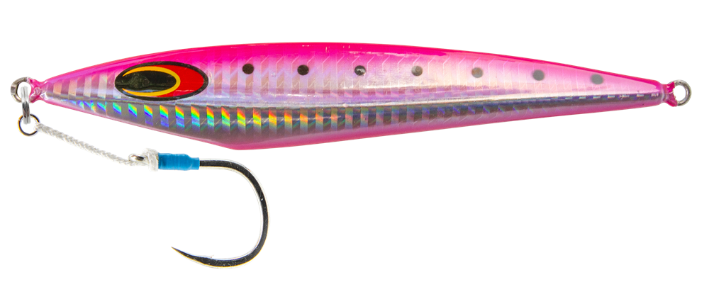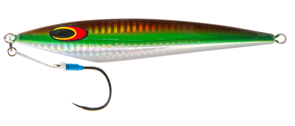 The unique shape and original design of the RIDGEBACK JIG creates an exciting new jig action. It can be worked as a slow pitch jig with a flick of the rod tip or worked fast as a high-speed jig. The unique angled head design creates an erratic sideways darting movement at the top of each lift of the rod. When used slow it will flutter before starting to sink quickly, making it ideal for slow pitch jigging applications. Work it fast or slow and it will shoot off to the side giving an erratic action both pelagic and bottom feeding fish cannot resist.