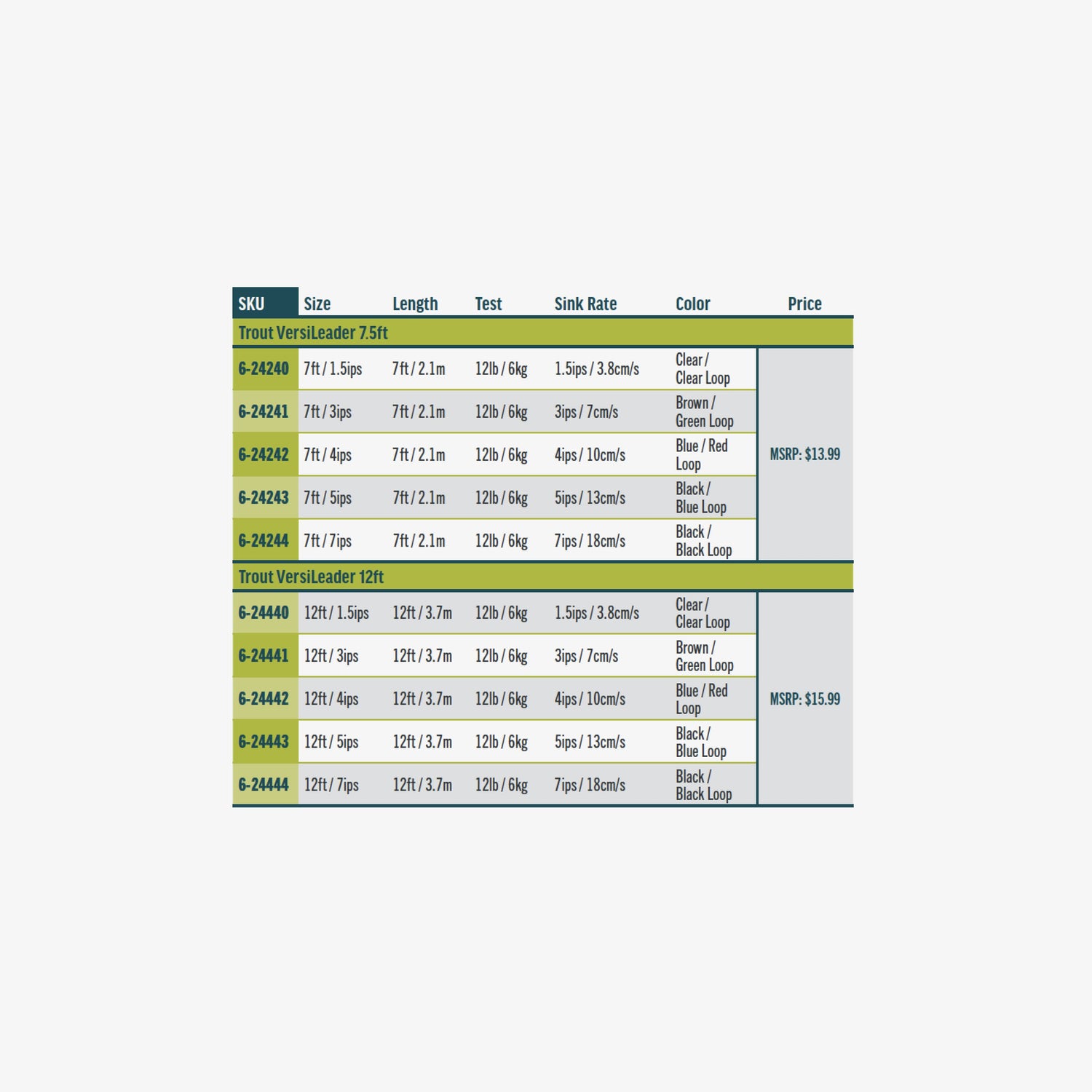 RIO's Trout VersiLeaders are designed for the fly fisher who needs a quick-change option for converting a floating line to a sink tip. Each VersiLeader is tapered for the best in performance and has a 12lb nylon core coated in PVC. A neat, bullet-proof welded loop at the butt end allows for fast rigging. There are two length options available, 7ft and 12ft, with the following sink rates: